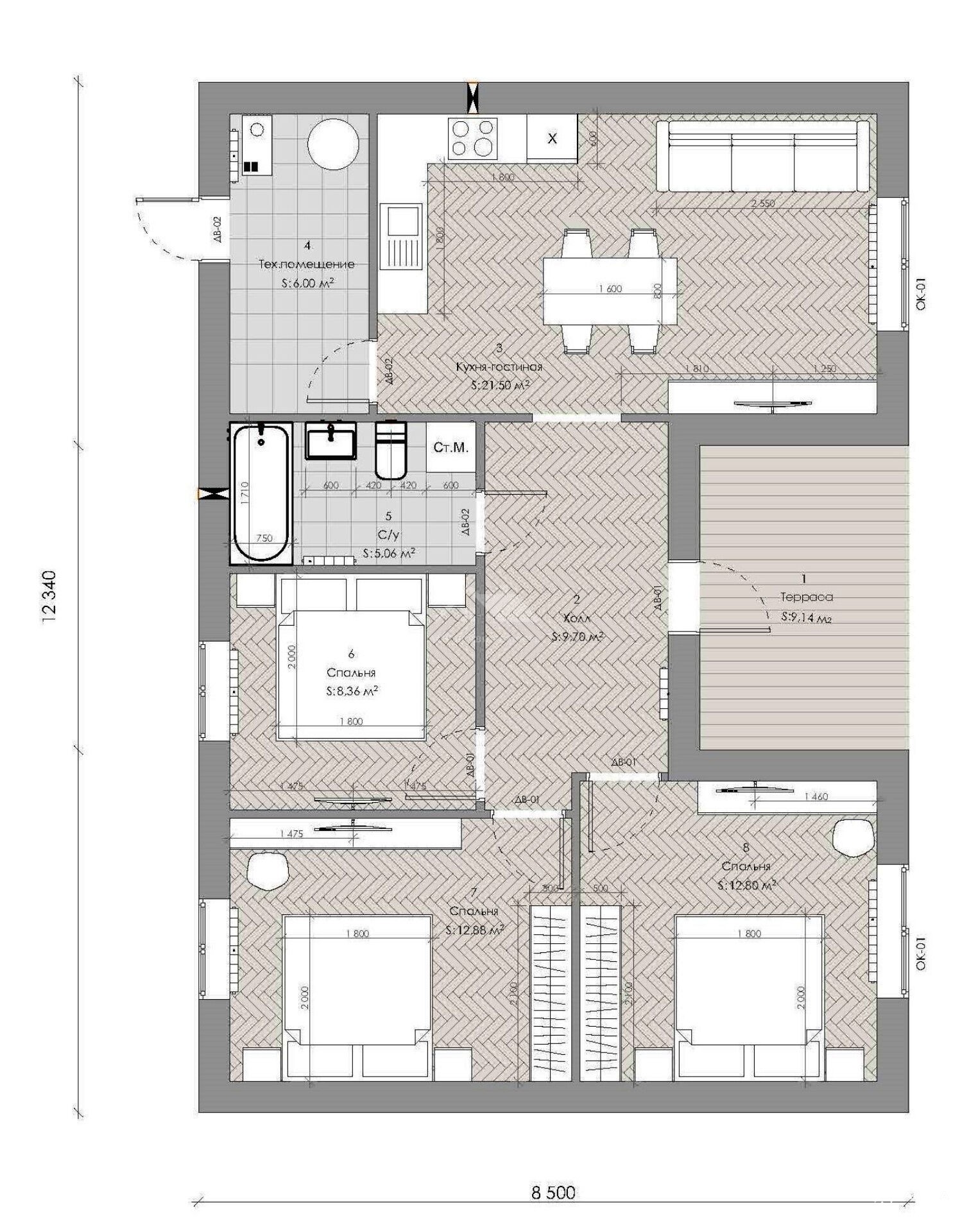 При входе в дом - уютная веранда. В доме имеется холл 10 кв.м, три изолированные комнаты 13, 2 кв.м, 13, 5 кв.м, 8, 5 кв.м и просторная кухня-гостиная 22 кв.м, бойлерная 6 кв.м. с выходом на улицу, совмещенный санузел 5, 5 кв.м. Высота потолков в чистовом исполнении 2, 80 м.